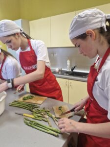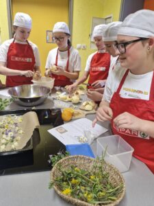 Učenci so pri izbirnem predmetu SPH pripravljali spomladanske jedi iz užitnih cvetlic in sezonskih špargljev. Pripravili so cvetne želejčke in pito s šparglji.